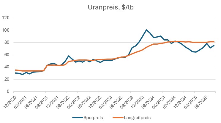 Obwohl die Spotpreise in den letzten Jahren erhebliche Schwankungen durchliefen, stiegen die langfristigen Uranpreise stetig an. In den letzten 12 Monaten blieb der langfristige Preis trotz des Abwärtsdrucks auf dem Spotmarkt konstant stabil bei ~80 USD/lb, was indirekt die langfristige These zur Kernenergie stützt.
